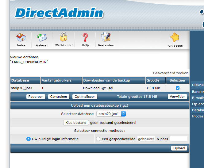 Ter verdere info hier nog een paar schermafbeeldingen van wat ik krijg als ik in Direct admin klik op controleer en repareer.