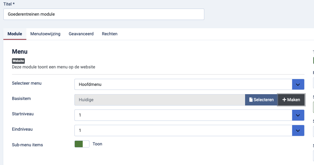 ik heb mijn eerste menu module aangemaakt, ingesteld op positie top B. Maar ik zie nog geen item goederentreinen erin.